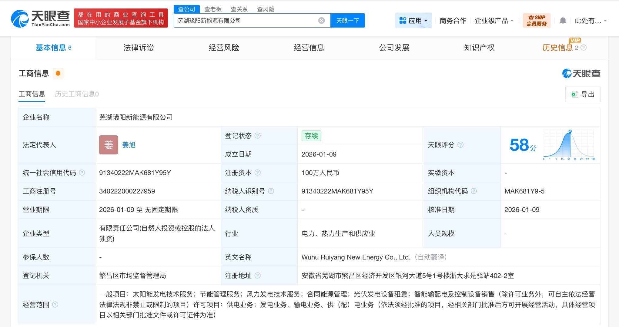 天眼查工商信息显示,近日,芜湖瑑阳新能源有限公司成立,法定代表人为姜旭,注册资本100万人民币,经营范围含太阳能发电技术服务、节能管理服务、风力发电技术服务、合同能源管理、光伏发电设备租赁、智能输配电及控制设备销售等。股东信息显示,该公司由阳光电源旗下合肥春阳新能源投资有限公司全资持股。