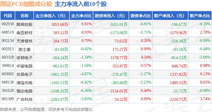 资金流向方面,国证PCB(980115)指数成份股当日主力资金净流出合计58.89亿元,游资资金净流入合计11.4亿元,散户资金净流入合计47.5亿元。成份股资金流向详情见下表: