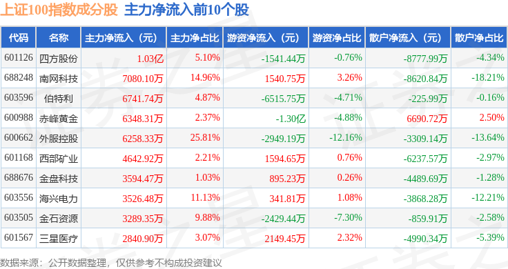 资金流向方面,上证100(000132)指数成份股当日主力资金净流出合计26.58亿元,游资资金净流入合计12.19亿元,散户资金净流入合计14.39亿元。成份股资金流向详情见下表: