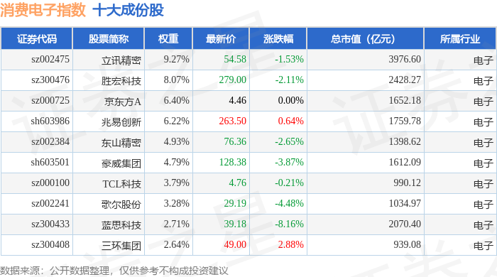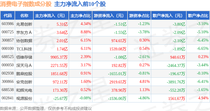 资金流向方面,消费电子(980030)指数成份股当日主力资金净流出合计120.07亿元,游资资金净流入合计40.11亿元,散户资金净流入合计79.96亿元。成份股资金流向详情见下表: