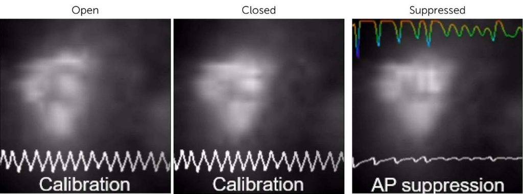 图1:秀丽隐杆线虫肌肉细胞的光遗传电压钳(OVC)图像,展示了其天然的开放和闭合形态,以及通过OVC控制强制抑制动作电位的过程。该图像使用Kinetix22系统在约30×30像素的感兴趣区域内获取。