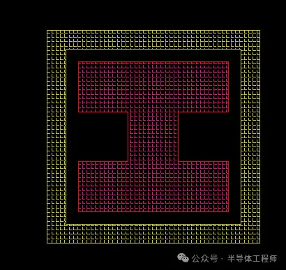 简单常用的光刻板对准标记比如上图,工是上一道芯片图案,黄色就是下一道光刻板的图案,二者套刻居中,就完成所有芯片的对准。