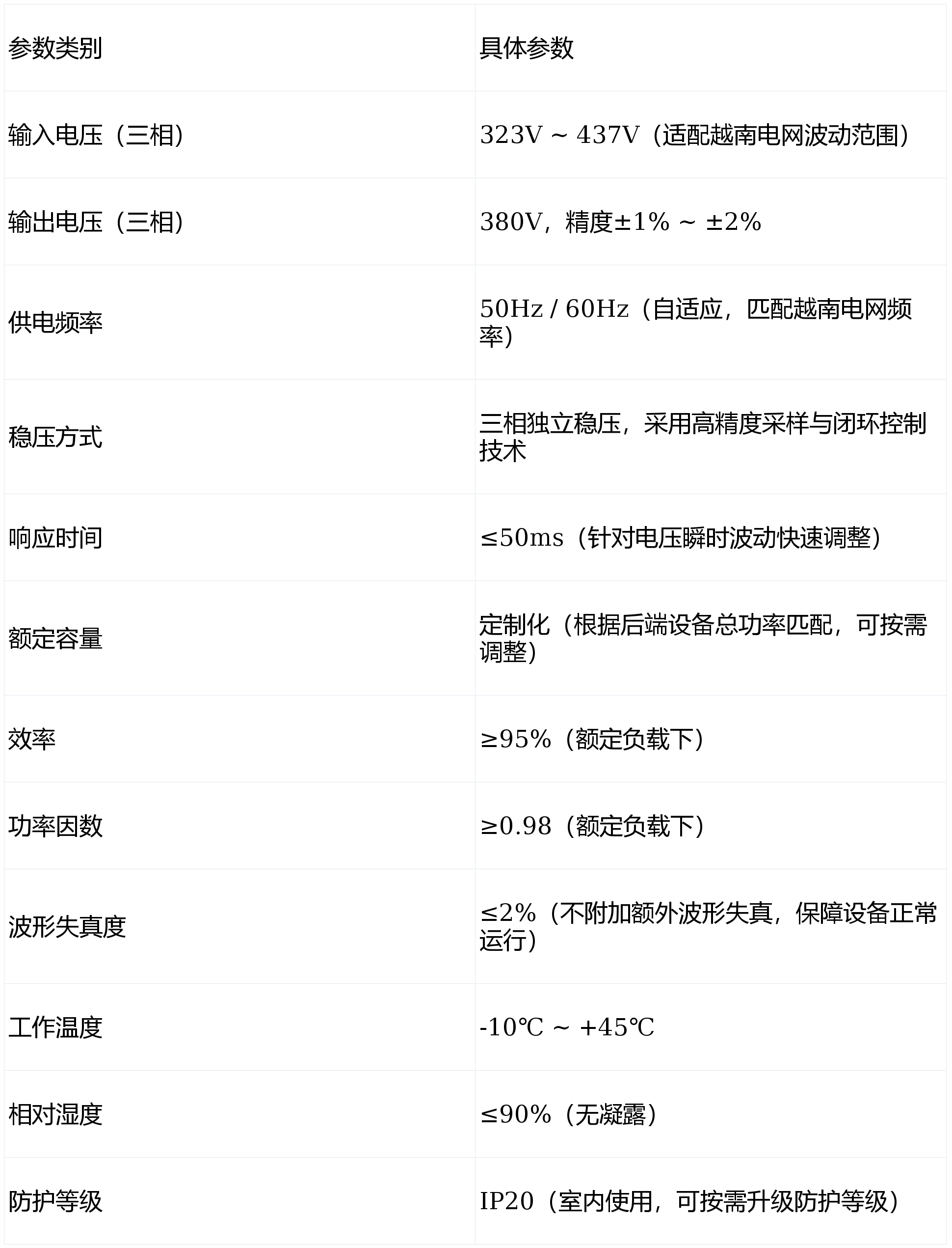 输入电压适配323V-437V宽范围,可完全覆盖越南现场电压波动区间,无论电网电压偏高或偏低,均能稳定输出380V标准电压,从根源解决电压波动对设备的影响。