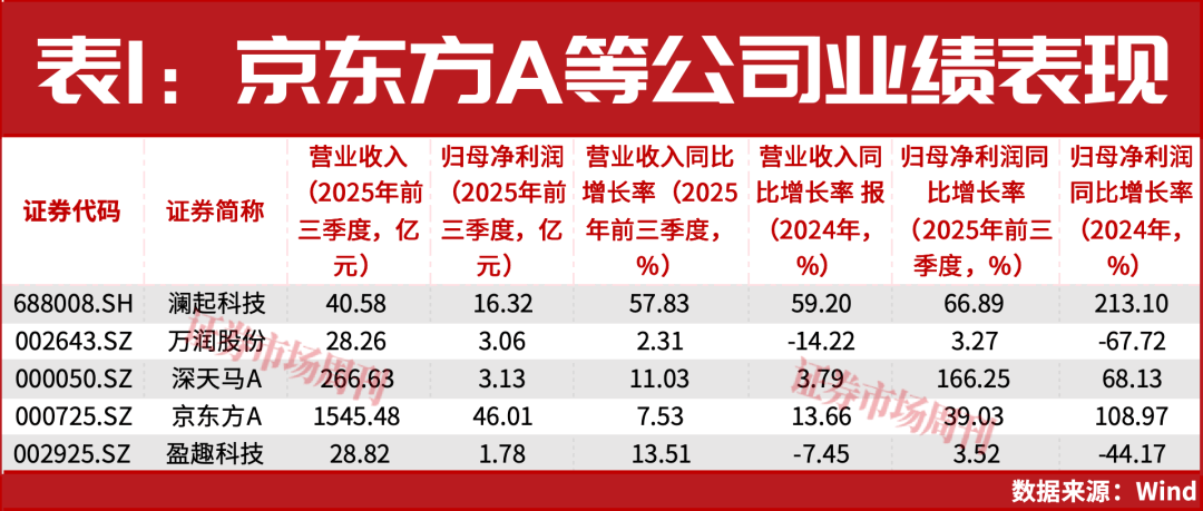 从基金持仓来看,据Wind统计,截至2025年9月30日,澜起科技、京东方A、万润股份的基金持股比例均超过1%,其中澜起科技的基金持股比例从2024年同期的26.68%增至30.5%,京东方A基本持平保持在5.3%,万润股份从0.01%增至1.23%。深天马A和盈趣科技的基金持股比例也有增长。