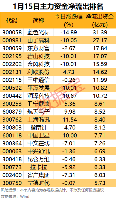 GEO概念股蓝色光标主力资金净流出31.39亿元,居首。汽车零部件股山子高科跌停,主力资金净流出27.17亿元。