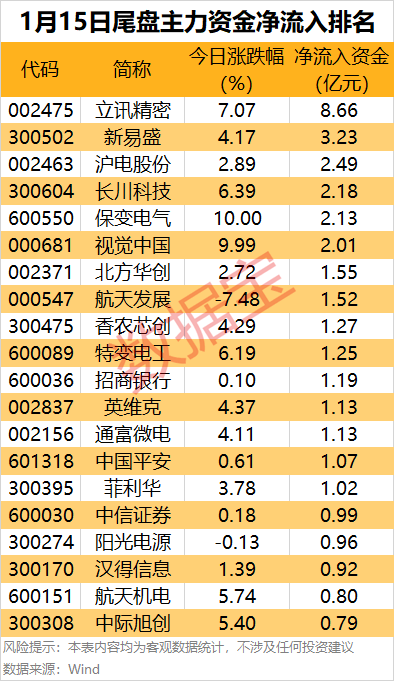 立讯精密尾盘主力资金净流入8.66亿元,居首;新易盛、沪电股份和长川科技等尾盘主力资金净流入均超2亿元。