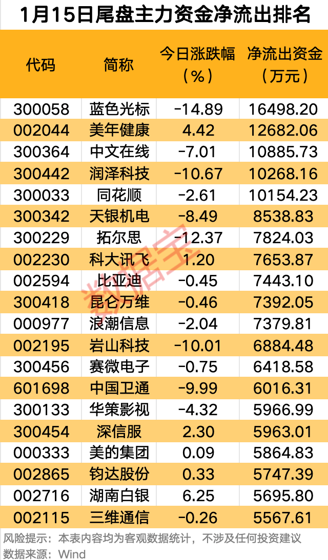 此外,还有美年健康、中文在线、润泽科技、同花顺和天银机电等尾盘主力资金净流出金额居前。