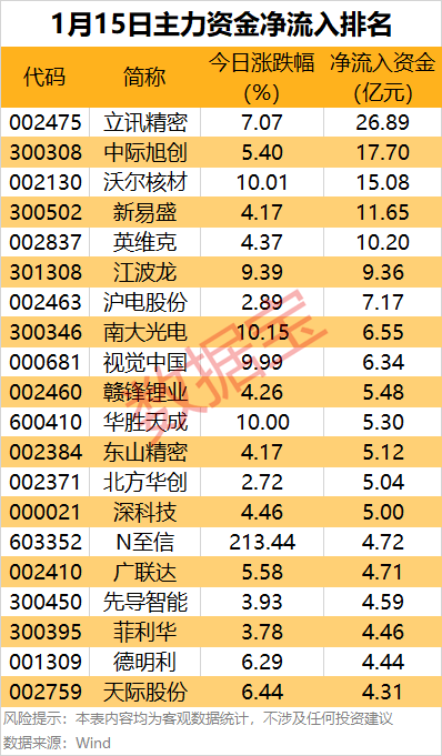 消费电子龙头股立讯精密主力资金净流入居首,达26.89亿元,股价上涨7.07%。
