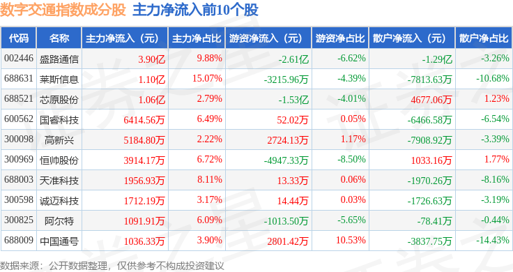 资金流向方面,数字交通(980075)指数成份股当日主力资金净流出合计29.58亿元,游资资金净流入合计1092.99万元,散户资金净流入合计29.47亿元。成份股资金流向详情见下表: