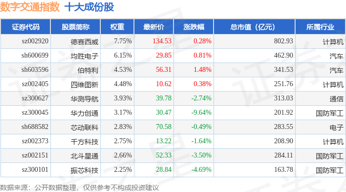 证券之星消息,1月15日,数字交通(980075)指数报收于3756.54点,跌1.23%,成交653.7亿元,换手率5.02%。当日该指数成份股中,上涨的有18家,盛路通信以9.97%的涨幅领涨,下跌的有32家,电科芯片以10.0%的跌幅领跌。