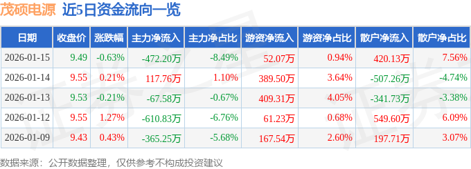 证券之星消息,截至2026年1月15日收盘,茂硕电源(002660)报收于9.49元,下跌0.63%,换手率1.71%,成交量5.86万手,成交额5560.44万元。