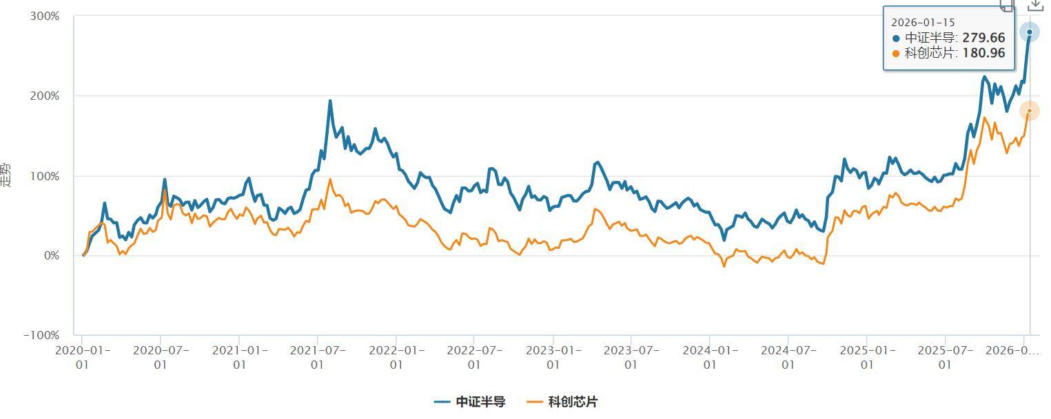 从长期表现看,中证半导体设备指数从2020年1月至今累计涨幅高达279.66%,大幅跑赢同期的科创芯片近100%。