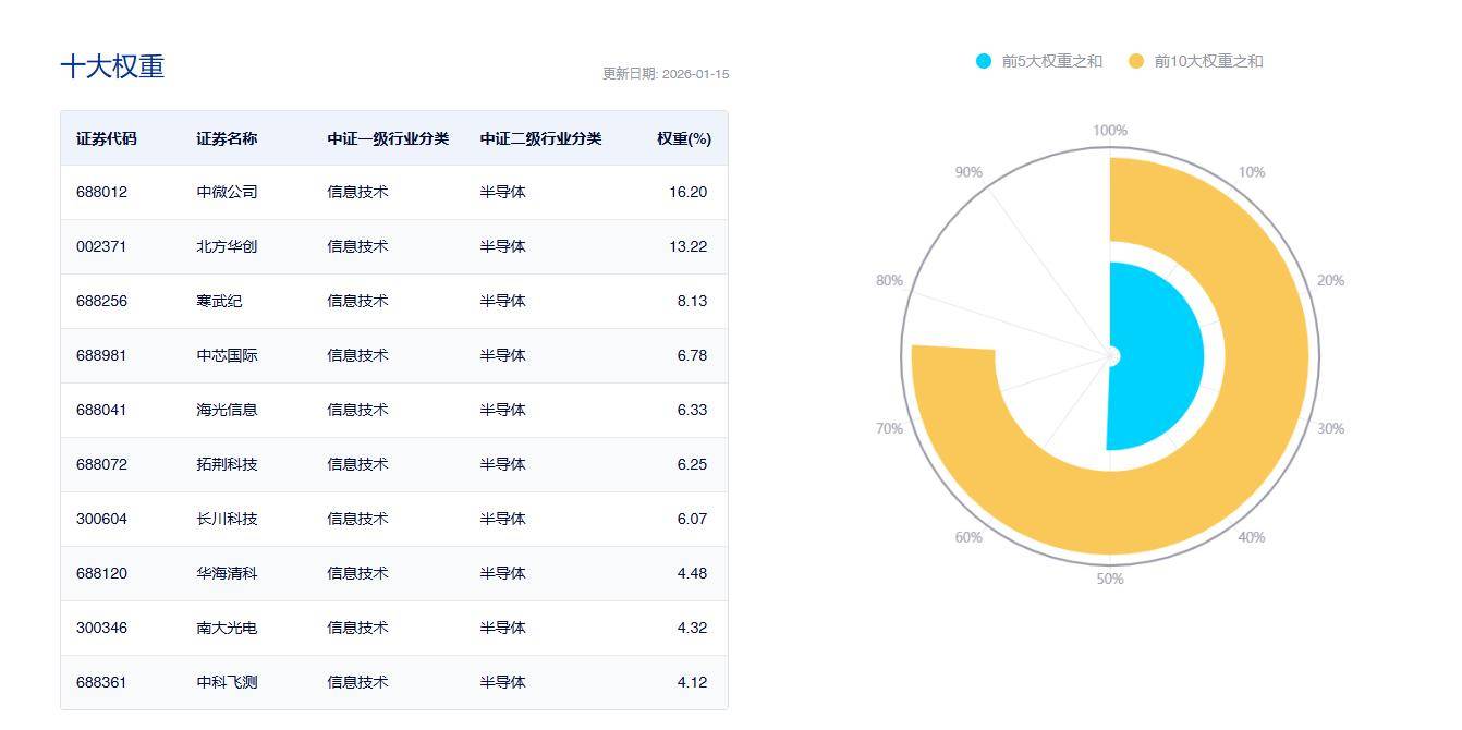 阵容非常“纯”: 它的持仓非常集中,前十大公司就占了快80%的权重。里头全是咱们国家的“硬核”龙头,比如做刻蚀机的中微公司、全能设备王北方华创,还有AI芯片大厂海光、寒武纪。