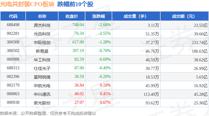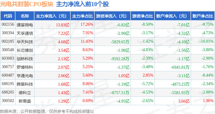 从资金流向上来看,当日光电共封装CPO板块主力资金净流入23.35亿元,游资资金净流出5.65亿元,散户资金净流出17.7亿元。光电共封装CPO板块个股资金流向见下表:
