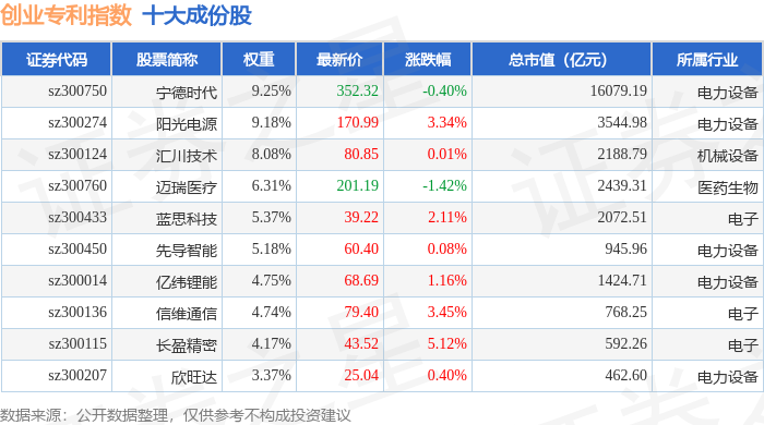 创业专利(970068)指数十大成份股详情如下: