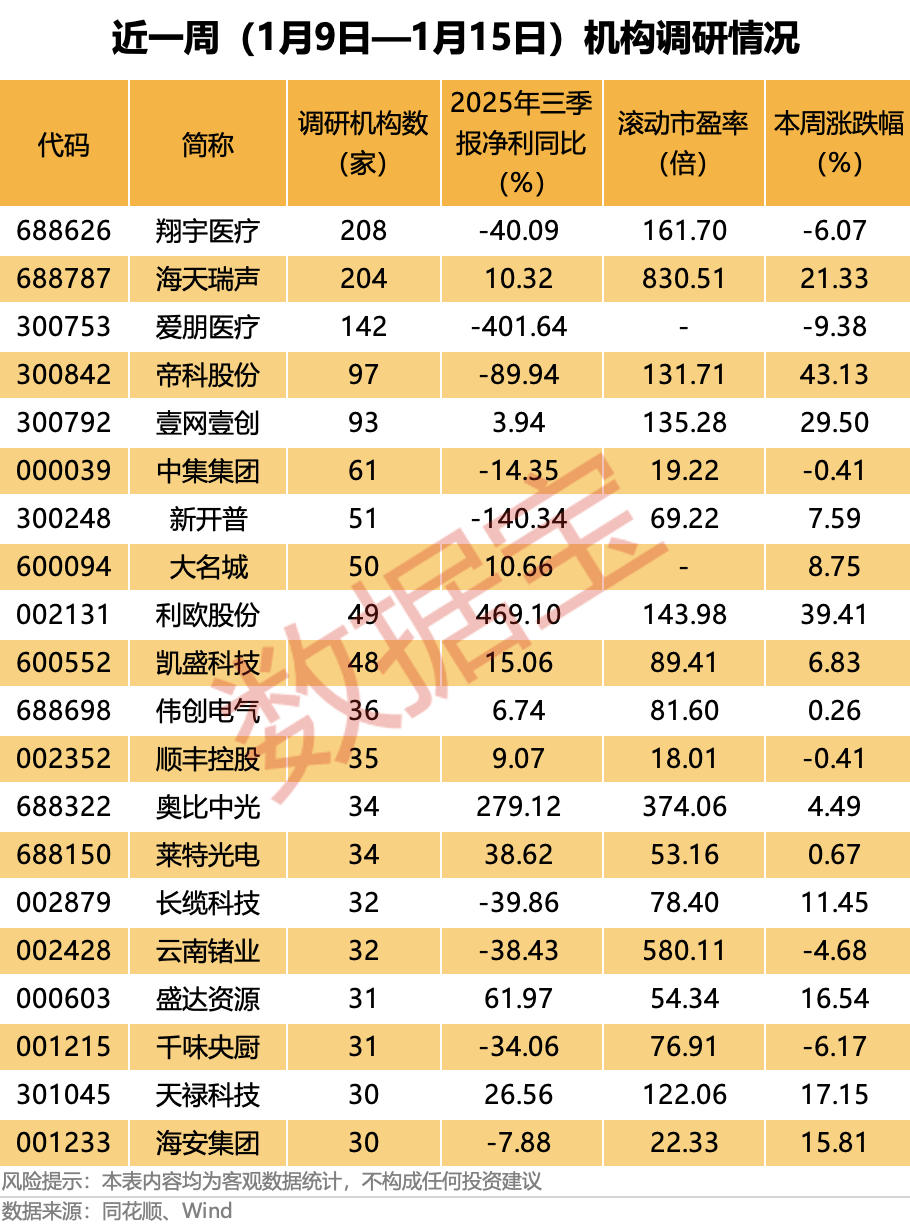 据证券时报·数据宝统计,翔宇医疗近一周(1月9日—15日)有208家机构调研,其中包括63家基金公司、21家证券公司、22家私募、13家保险公司等。