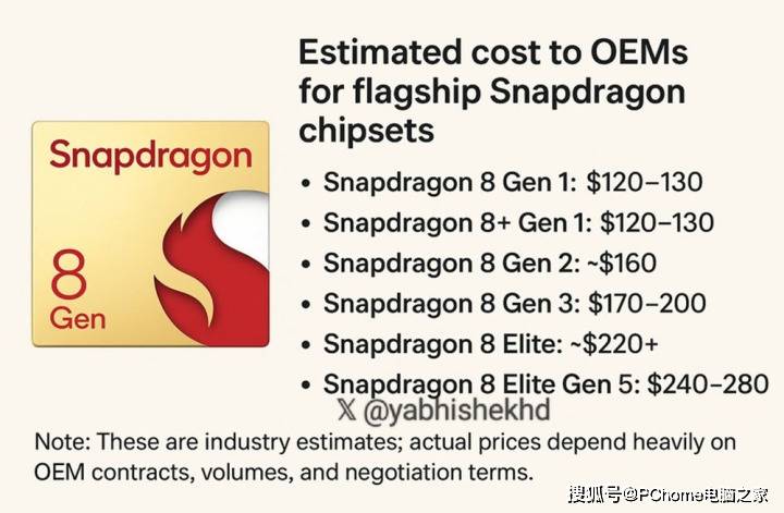 消息人士透露,高通新一代的骁龙8 Elite Gen6的单片价格可能会超过300美元,毕竟骁龙8 Elite Gen5的价格已经高至280美元。当然,最终的售价也要受到采购规模等因素影响,哪怕以300美元的价格来算,价格就已经达到了2090元人民币,已经足够买一款性价比不错的中端手机了。