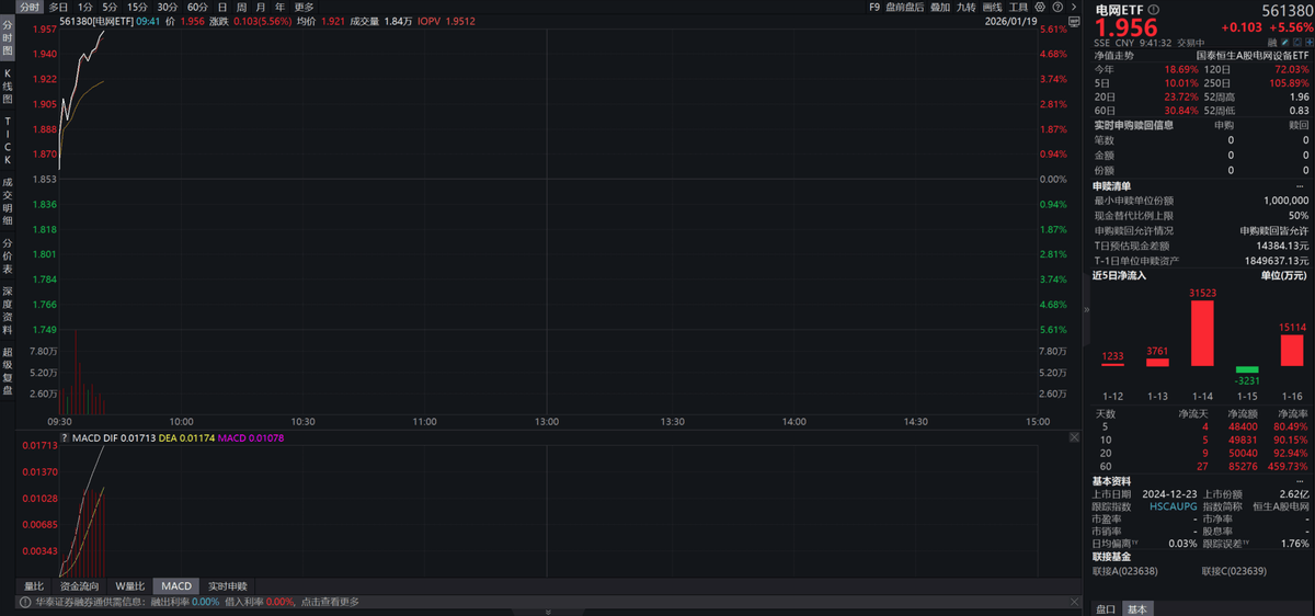 国内电网建设持续加速,北美缺电仍在持续演绎,电网设备板块利好不断。电网ETF(561380)开盘大涨超6%,资金抢筹布局,近5日净流入超5亿元。