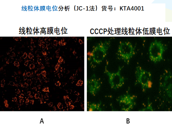 1、比率型探针(代表:JC-1):这种探针的荧光特性会随着膜电位变化而发生根本性转变。在线粒体功能正常、膜电位高时,JC-1在线粒体基质内聚集形成聚合物,发射红色荧光;当功能受损、膜电位下降时,JC-1则以单体形式存在,主要发射绿色荧光。通过分析红/绿荧光的比值变化,可以非常灵敏且定量地反映膜电位的细微波动。这种比率法设计,使得结果不易受染料负载量、细胞数量等实验变量影响,数据更稳定可靠。