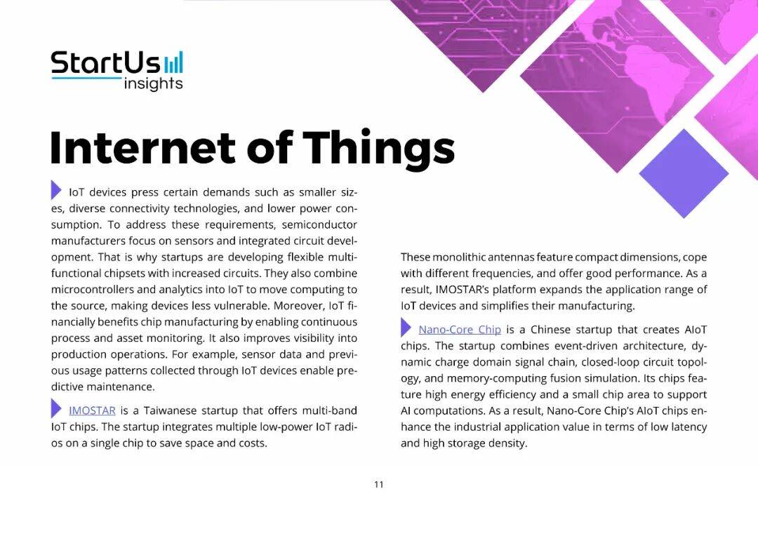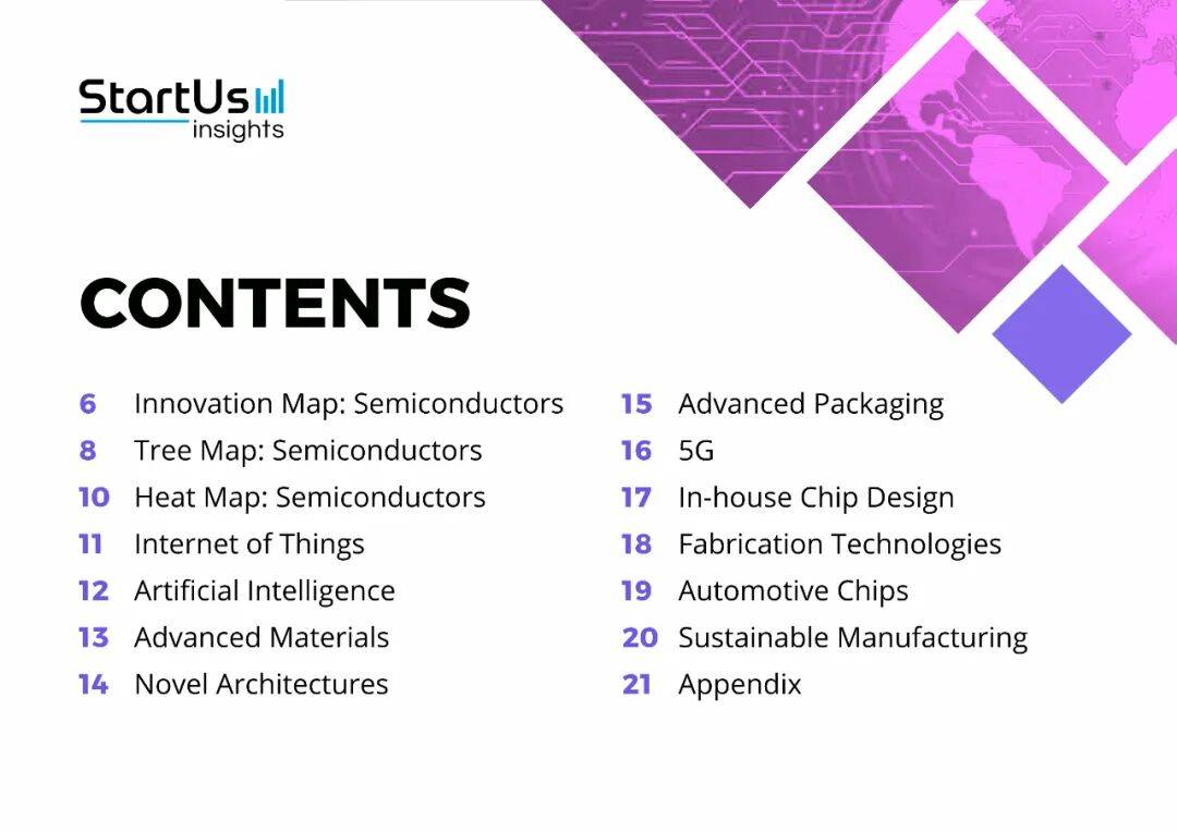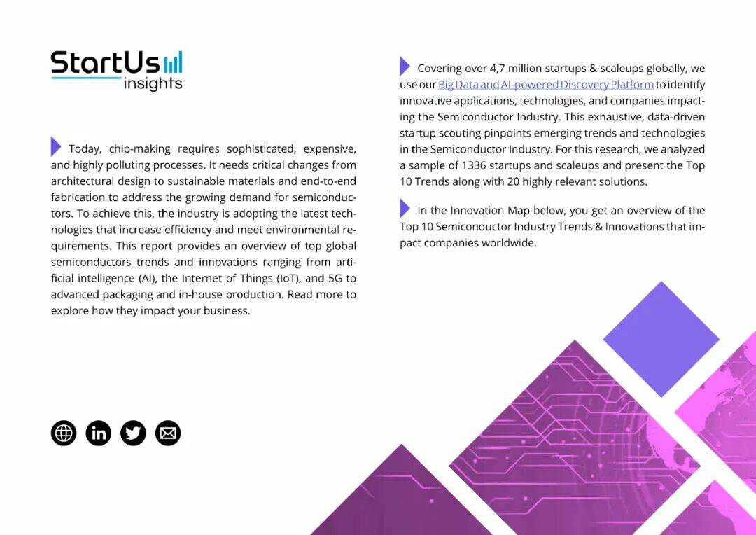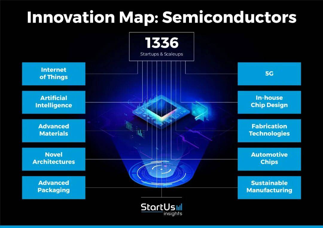 在这一宏观背景下,StartUs Insights 用大数据平台扫描了 470 万家初创与成长型企业,最终聚焦 1336 家半导体公司,提炼出十大趋势。它们不是孤立的技术点,而是一张互相咬合的“创新网络”: