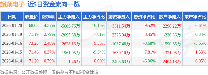 证券之星消息,截至2026年1月20日收盘,超颖电子(603175)报收于68.08元,下跌4.37%,换手率11.5%,成交量5.06万手,成交额3.48亿元。