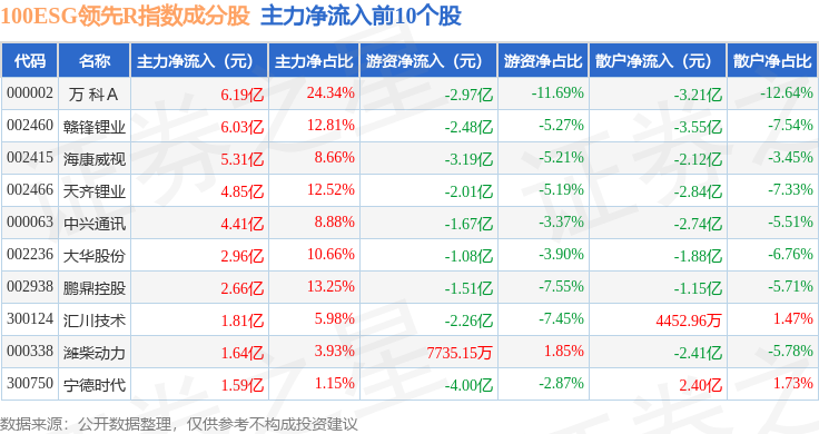 资金流向方面,100ESG领先R(470030)指数成份股当日主力资金净流入合计7.38亿元,游资资金净流出合计19.71亿元,散户资金净流入合计12.33亿元。成份股资金流向详情见下表: