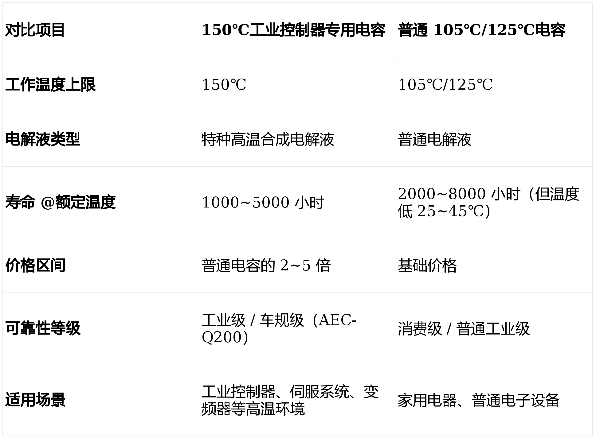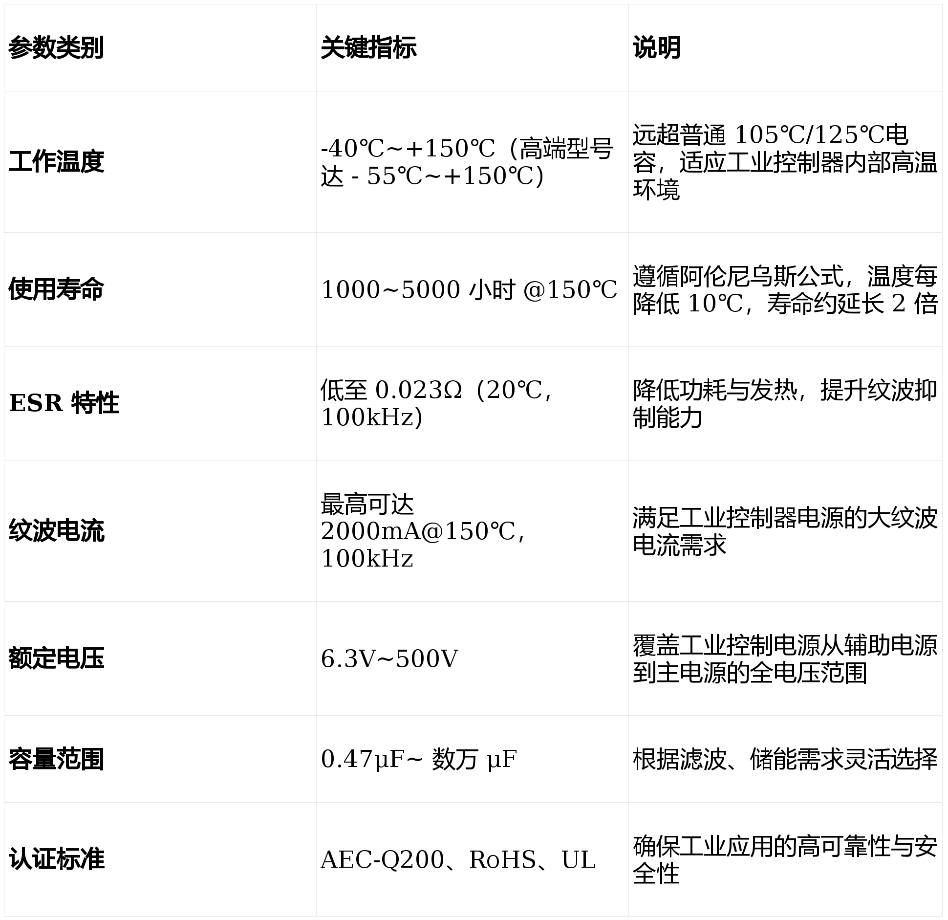 工业控制器专用 150℃铝电解电容是为极端高温环境下稳定工作而设计的储能滤波元件,主要用于 PLC、伺服驱动器、变频器、工业电源等设备的电源电路,具有超高温耐受、高可靠性、长寿命和低 ESR等核心特性,是保障工业控制系统在恶劣工况下连续运行的关键元器件。