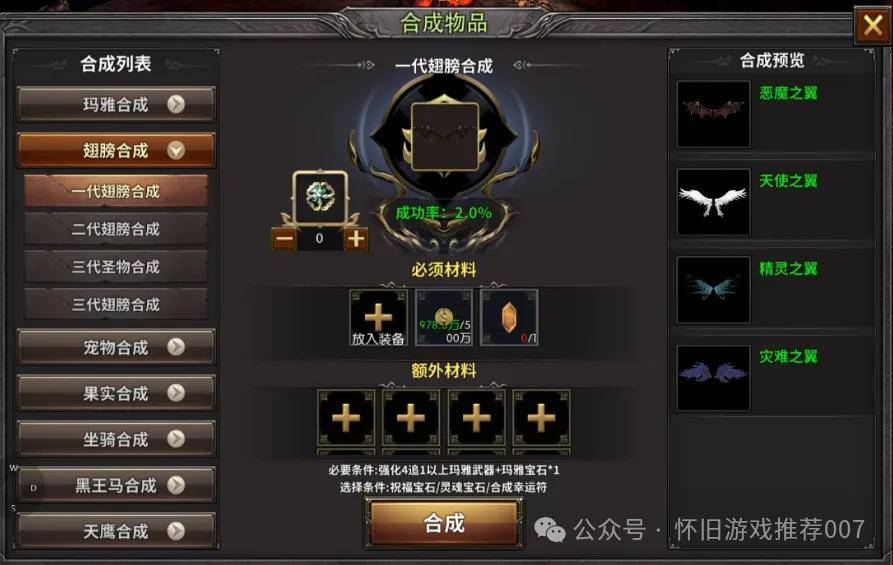 游戏里的翅膀颜值高、光效足,升级后外观和光效会变化,跑起来有流光拖尾,颜值能打。最良心的是,所有可强化道具规则统一,新手也能轻松懂:+7前用祝福宝石100%成功,快速拉满基础战力;+7到+9用灵魂宝石,失败不碎仅等级清零;+10以上需用合成保护符,失败可保住道具。这也是它圈粉的关键——平民不用氪金,日常攒材料就能养出好看又强力的翅膀装备,不被土豪碾压。提醒大家:强化别心急,日常攒材料先冲+7稳扎稳打,后期再慢慢升级,别浪费材料在前期。