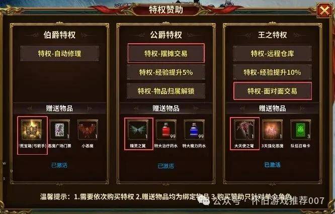三档永久特权无套路,按需选择即可:10元档(新手优选)——送开荒三天+9套装,轻松度开荒、少走弯路;68元档(长期/搬砖党)——解锁永久0手续费摆摊权,赠三天一阶翅膀使用权;98元档(深耕/省心党)——解锁永久面对面交易和远程仓库,适配搬砖、冲榜需求。