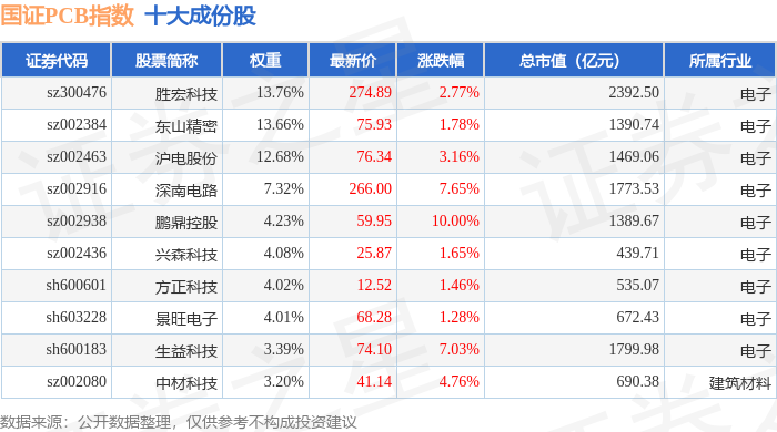 证券之星消息,1月22日,国证PCB(980115)指数报收于4941.67点,涨3.22%,成交673.36亿元,换手率5.47%。当日该指数成份股中,上涨的有31家,崇达技术以10.03%的涨幅领涨,下跌的有9家,路维光电以8.59%的跌幅领跌。