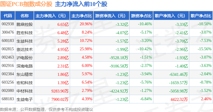 资金流向方面,国证PCB(980115)指数成份股当日主力资金净流入合计28.54亿元,游资资金净流出合计16.02亿元,散户资金净流出合计12.53亿元。成份股资金流向详情见下表: