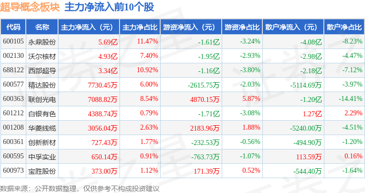 从资金流向上来看,当日超导概念板块主力资金净流入12.95亿元,游资资金净流出5.0亿元,散户资金净流出7.95亿元。超导概念板块个股资金流向见下表: