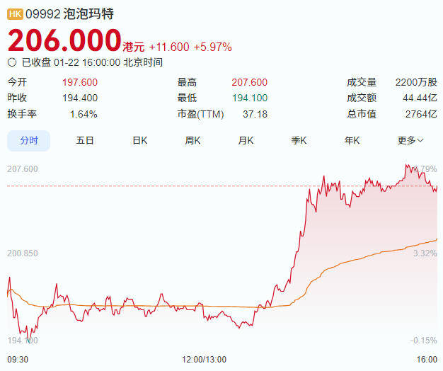 截至发稿,泡泡玛特港股午后大涨超6%,现报207.6港元/股,市值2785亿港元。