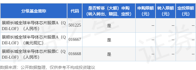 证券之星消息,1月23日景顺长城基金管理有限公司发布《关于景顺长城全球半导体芯片产业股票型证券投资基金(QDII-LOF)暂停申购(含日常申购和定期定额投资)业务的公告》。公告中提示,为因受外汇额度限制,为充分保护基金份额持有人利益,保障基金平稳运作,自2026年1月23日起景顺长城全球半导体芯片产业股票型证券投资基金(QDII-LOF)暂停申购(含日常申购和定期定额投资)业务,下属分级基金调整明细如下: