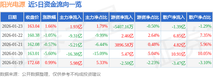 证券之星消息,截至2026年1月23日收盘,阳光电源(300274)报收于163.04元,上涨1.66%,换手率4.16%,成交量66.07万手,成交额107.69亿元。
