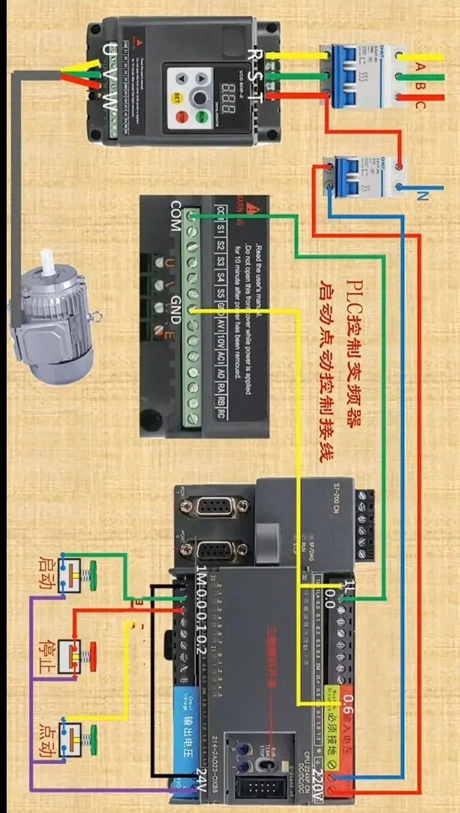 10、PLC控制变频器启动点动控制实物彩图接线