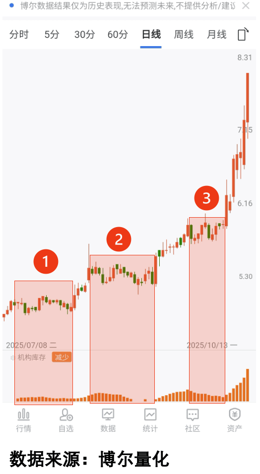 就拿这只股票来说,看图1,表面看20天只涨了8%,一天不到1个点,换做以前我也会直接划走,觉得这股票没爆发力,不值得花时间。但通过量化大数据看「机构库存」数据——也就是反映机构交易活跃程度的指标,会发现这段时间代表活跃的橙色柱体一直持续,说明机构一直在积极参与交易,没有因为股价震荡就停下。