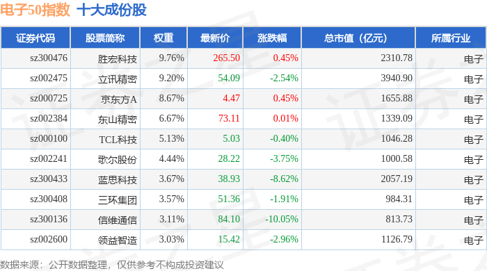 电子50(399281)指数十大成份股详情如下: