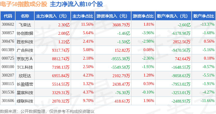 资金流向方面,电子50(399281)指数成份股当日主力资金净流出合计68.5亿元,游资资金净流入合计20.49亿元,散户资金净流入合计48.01亿元。成份股资金流向详情见下表: