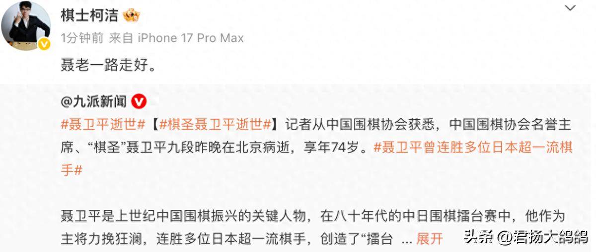在2024年,他还曾公开为柯洁“出头”,称LG杯决赛是围棋界的悲剧,