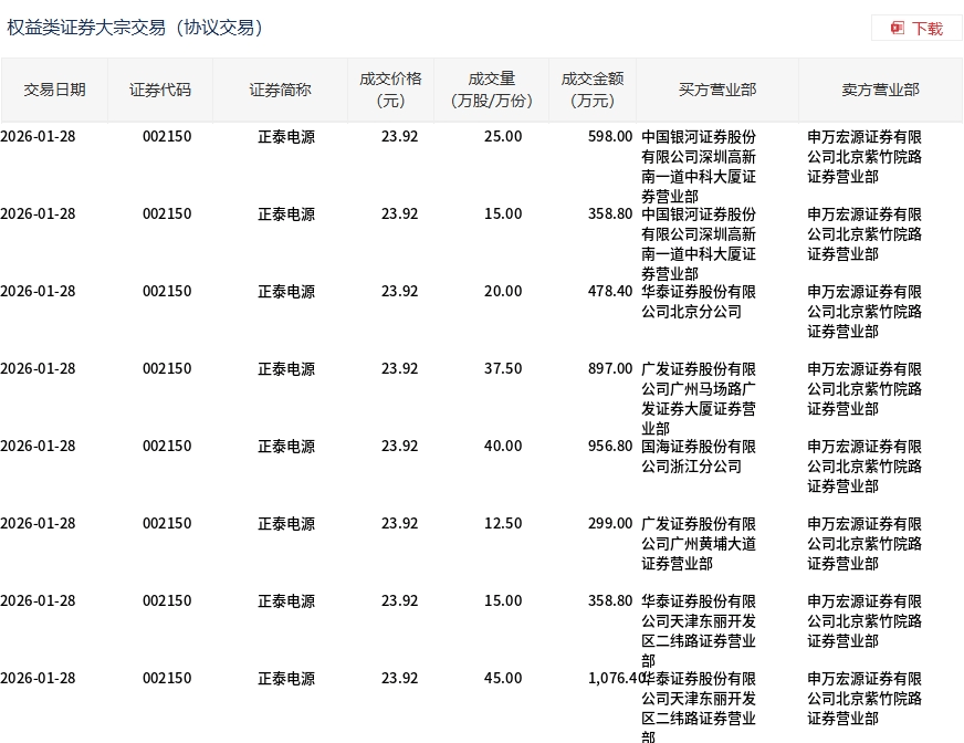 1月28日,正泰电源大宗交易成交210万股,成交额5023.2万元,占当日总成交额的4.19%,成交价23.92元,较市场收盘价26.29元折价9.01%。