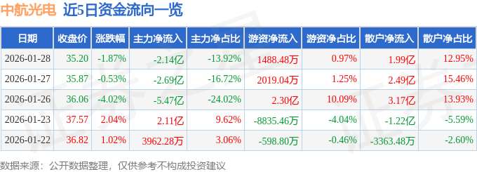 1月28日的资金流向数据方面,主力资金净流出2.14亿元,占总成交额13.92%,游资资金净流入1488.48万元,占总成交额0.97%,散户资金净流入1.99亿元,占总成交额12.95%。