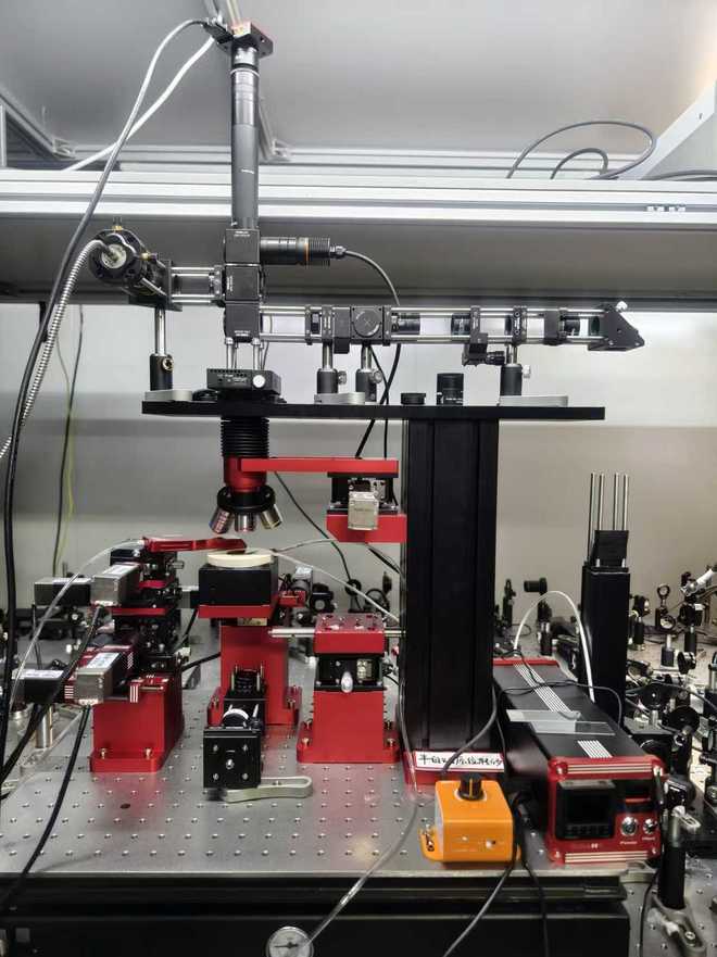 这是自主搭建的高精度半自动原位转角叠层光学晶体转移台,可进行光学晶体高精度转角堆叠并实时监控激光输出效率,最终实现高效转角光学晶体构建。新华社发(作者供图)