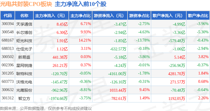 从资金流向上来看,当日光电共封装CPO板块主力资金净流出37.69亿元,游资资金净流入3.25亿元,散户资金净流入34.44亿元。光电共封装CPO板块个股资金流向见下表: