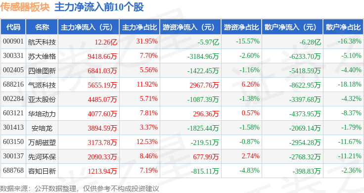 从资金流向上来看,当日传感器板块主力资金净流出99.19亿元,游资资金净流入19.56亿元,散户资金净流入79.62亿元。传感器板块个股资金流向见下表: