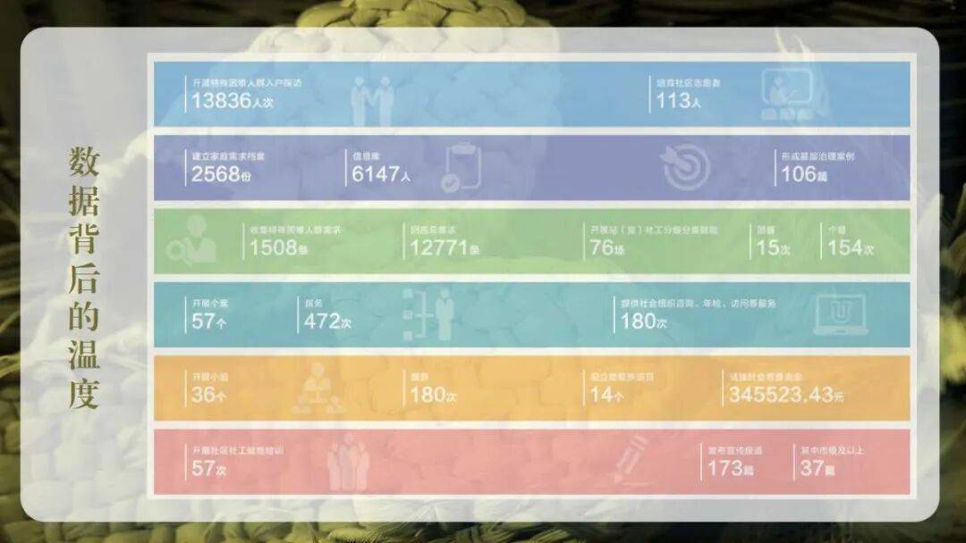 牵头组织社工、社区工作者、志愿者开展入户探访13836人次,建立完善居民精准服务档案2568份,有效回应各类人群需求12771条,需求回应率达84.7%;累计开展个案服务57个、小组活动36个,覆盖各类服务对象数百人,真正实现“居民有需求、社工有回应、服务有温度”。