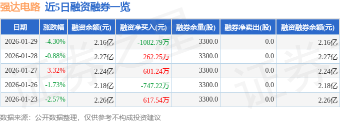 证券之星消息,截至2026年1月29日收盘,强达电路(301628)报收于94.87元,下跌4.3%,换手率7.55%,成交量2.46万手,成交额2.37亿元。