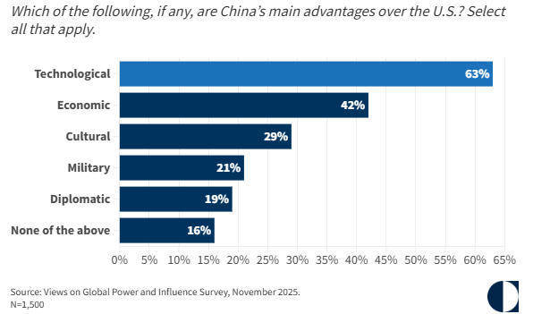 当被问及中国在哪些方面拥有优势时,63%的受访者表示,中国在科技方面优于美国。值得注意的是,74%的民主党人、62%的独立人士和52%的共和党人对此观点表示赞同。