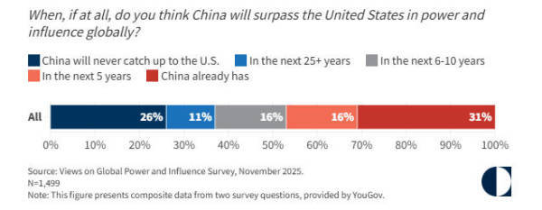 结果显示,47%的受访者认为,中国已经超过美国,或将在未来五年内做到这一点。另有27%认为这一转变需要更长时间。只有26%认为中国永远追不上美国。