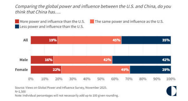 根据结果,高达64%受访者认为,中国已经在实力和影响力上赶上或超越美国。